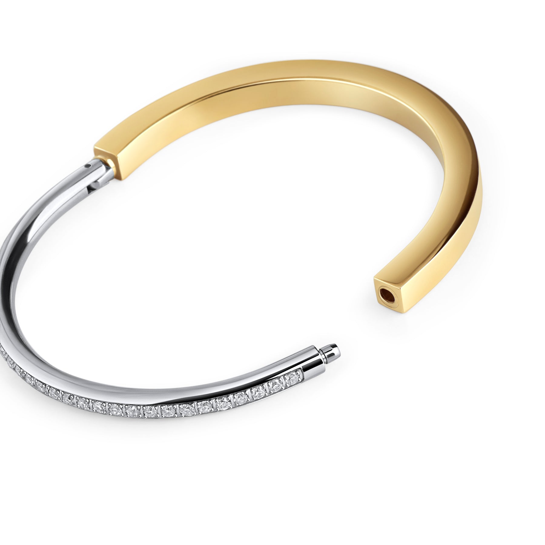 For the woman who loves blending elegance with modernity, this two-tone rectangular bracelet with sparkling stones is a true statement piece. It delicately enhances the wrist while expressing a refined and bold style.